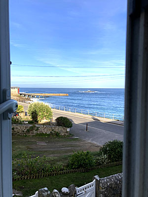 To the rear is a large courtyard with rear access and plenty of room for surfboards. There are three bedrooms, one with a double bed and vanity unit, one twin bedded room with sea views and the third with bunk beds and also sea views. The