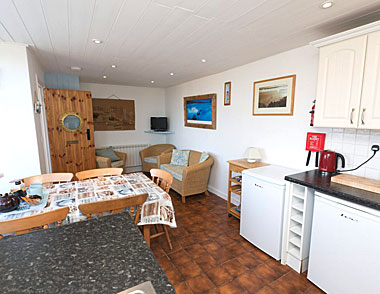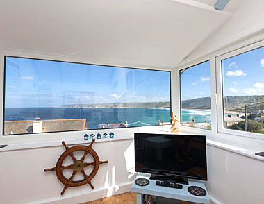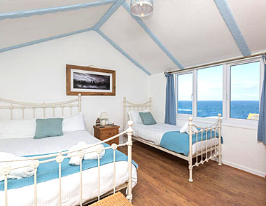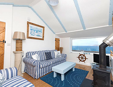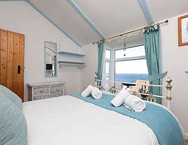The lounge is also on the first floor and has a large panoramic window offering stunning views over Sennen Cove and the beach. There are two sofas, coffee table, TV/DVD player and wood burning stove.