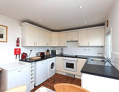 Downstairs there is a open plan kitchen and dining room with seating area. The kitchen is very well equipped with fridge, freezer, washing machine and dishwasher.